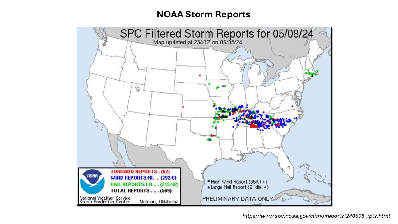 A major hailstorm passed through the southern Appalachians on May 8, 2024. Radar suggests several potential areas of very large hail, but in the weeks that followed, satellite-based monitoring suggests that only some areas had major damage as a result of this system. There is a research need to improve how well we can connect weather-related technologies that suggest broad swaths of potential impacts and forest impact monitoring technologies that document actual impacts at much finer resolution.